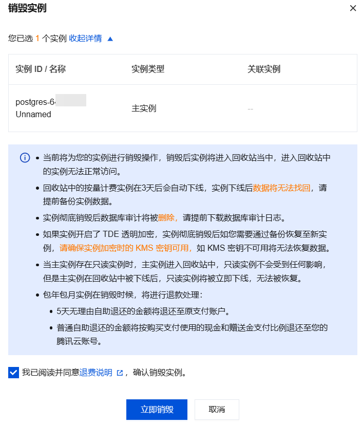 本文为您介绍如何通过云数据库 PostgreSQL 控制台销毁实例。