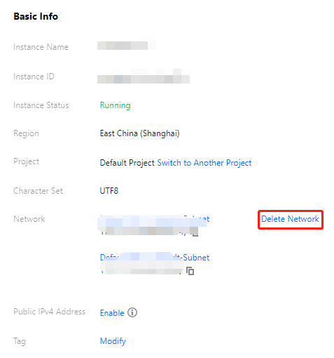 3. 待实例状态为运行中时,在所属网络后单击删除网络,选择基础网络,单击删除,该实例所属网络即可由原来的基础网络变更为新的私有网络。