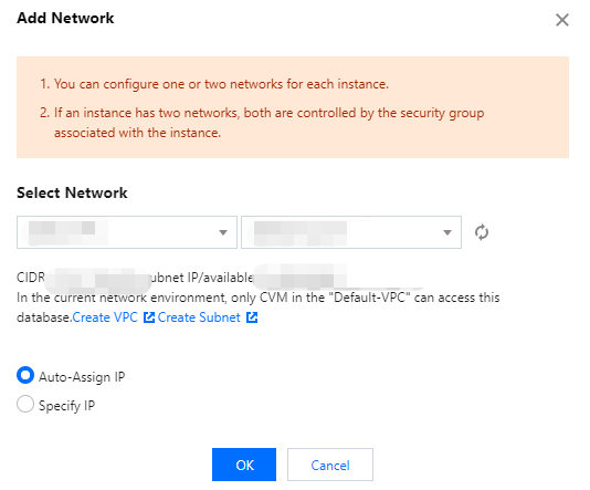 2. 在实例详情页的基本信息 > 所属网络后,单击新增网络,选择需要的私有网络,并单击确定。