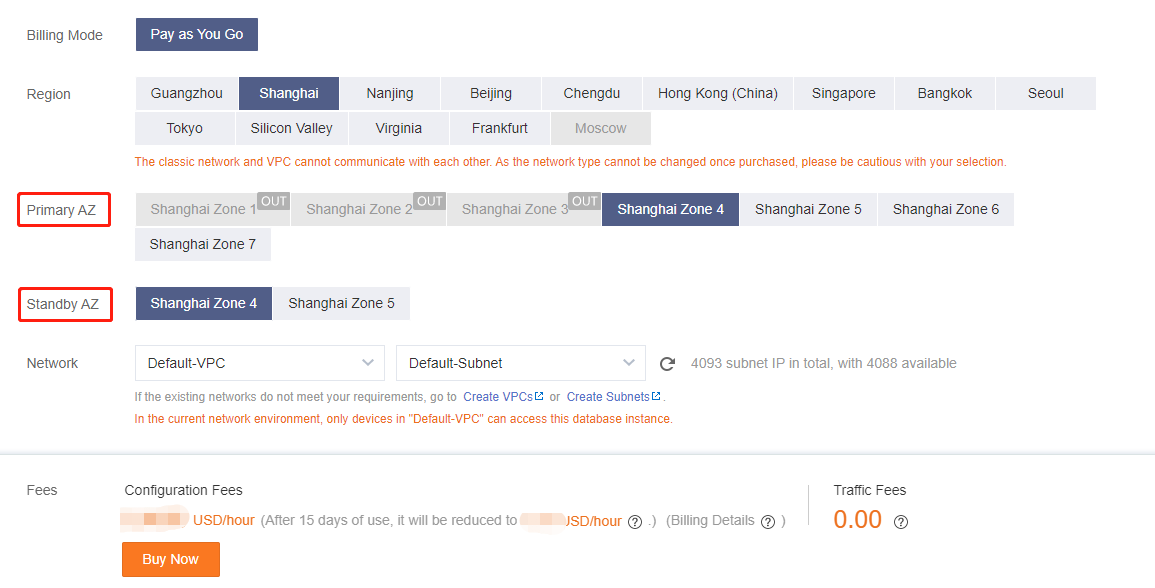 2. 在购买页选择对应地域,并在该地域下设置主可用区和备可用区区域。
