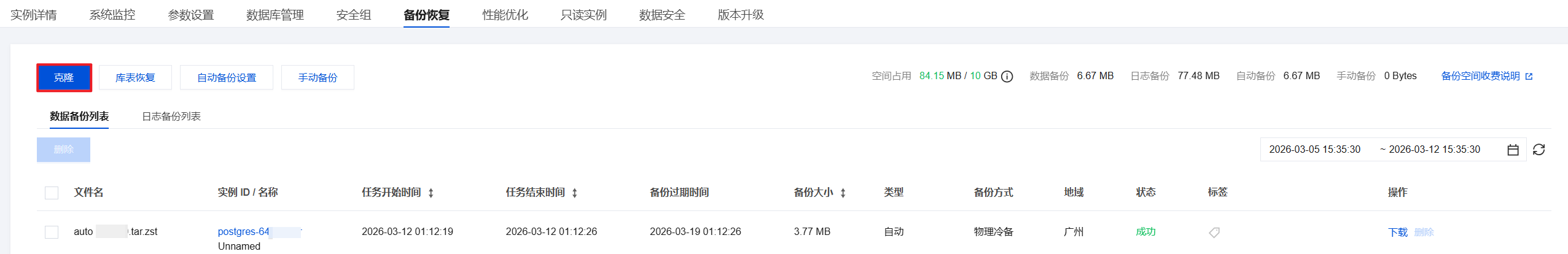2. 在实例管理页面,选择备份恢复 > 数据备份列表页,在左上角单击克隆。