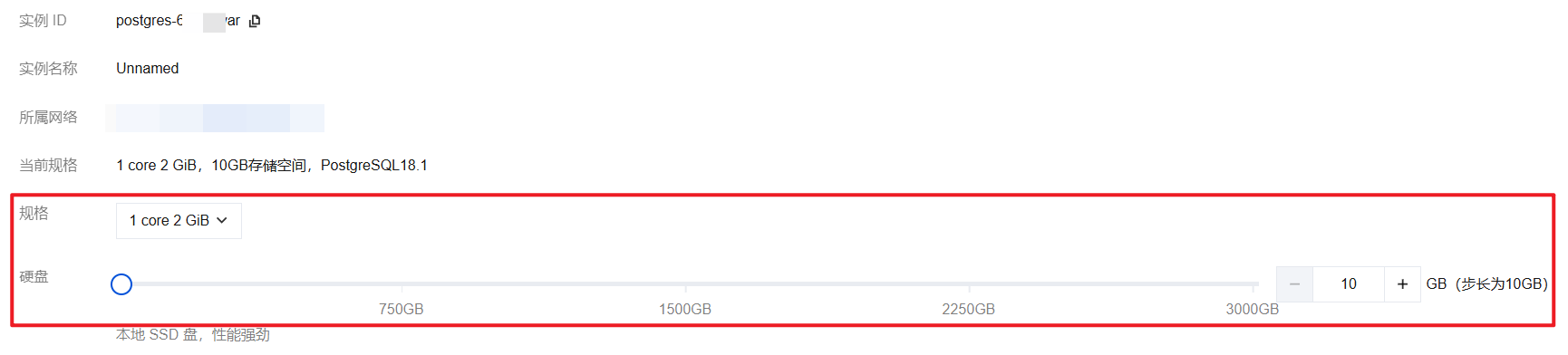 为了给压缩备份文件的还原留出足够空间,系统默认新实例存储规格至少为压缩文件的四倍,克隆完毕后可进行缩容,避免空间浪费。您可登录 控制台,进入实例详情,单击配置信息中的调整配置,修改实例规格和硬盘容量。