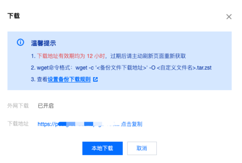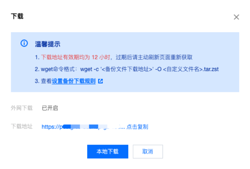 4. 在下载窗口,提供内网 VPC 网络地址和本地下载两种下载方式。