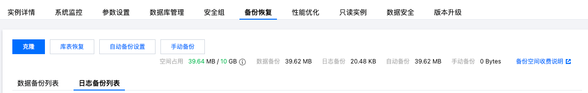 2. 在实例管理页面,选择备份恢复页,单击日志备份列表。