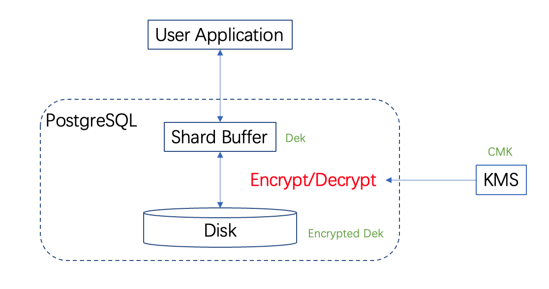 腾讯云数据库 PostgreSQL 通过向用户申请使用 KMS(Key Management Service)服务中保存的主密钥,生成 DEK(Data Encryption Key)密文与 DEK 明文对云产品加密所使用的密钥进行数据加密和解密。