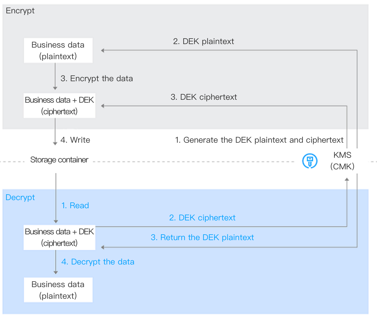 此类加密方案被称为信封加密,即用另一个密钥对密钥进行加密的过程。信封加密是一种应对海量数据的高性能加解密方案。其可通过生成 DEK 来对本地数据进行加解密,保证了业务加密性能的要求,同时也由 KMS 确保了数据密钥的随机性和安全性。