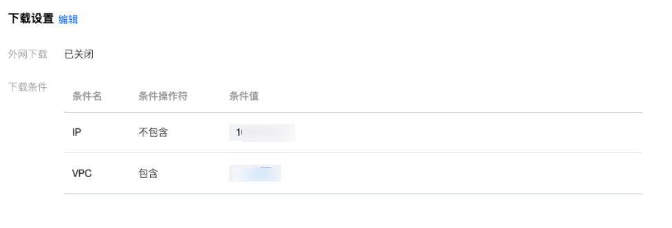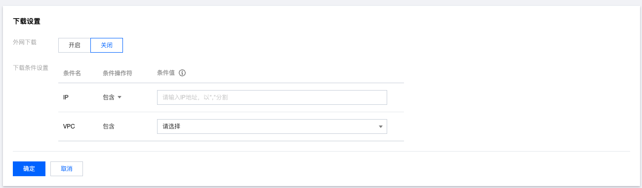 关闭:关闭外网下载时,可以对下载条件进行设置,设置条件包含 IP、VPC。