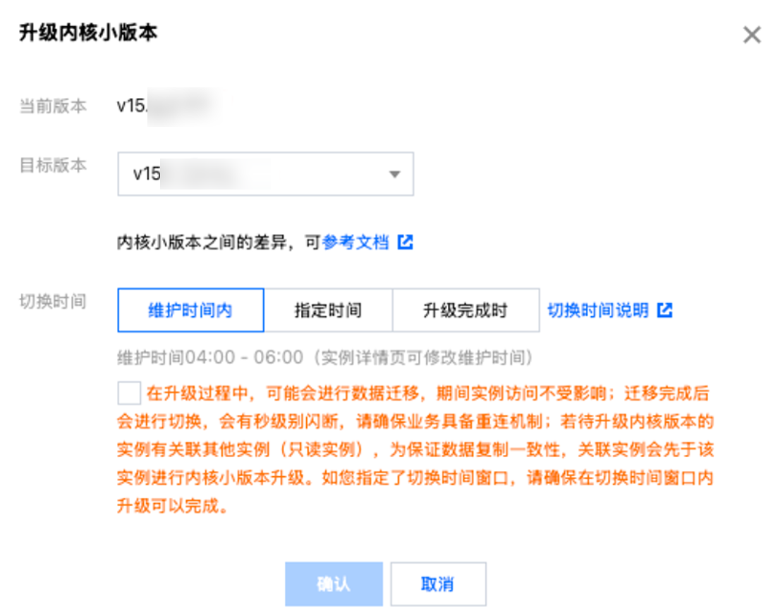 数据库内核小版本升级可能会涉及到数据迁移,在升级完成时会发生秒级闪断,建议您选择切换时间为维护时间内,实例会在升级完成后的下一个维护时间内发起切换。