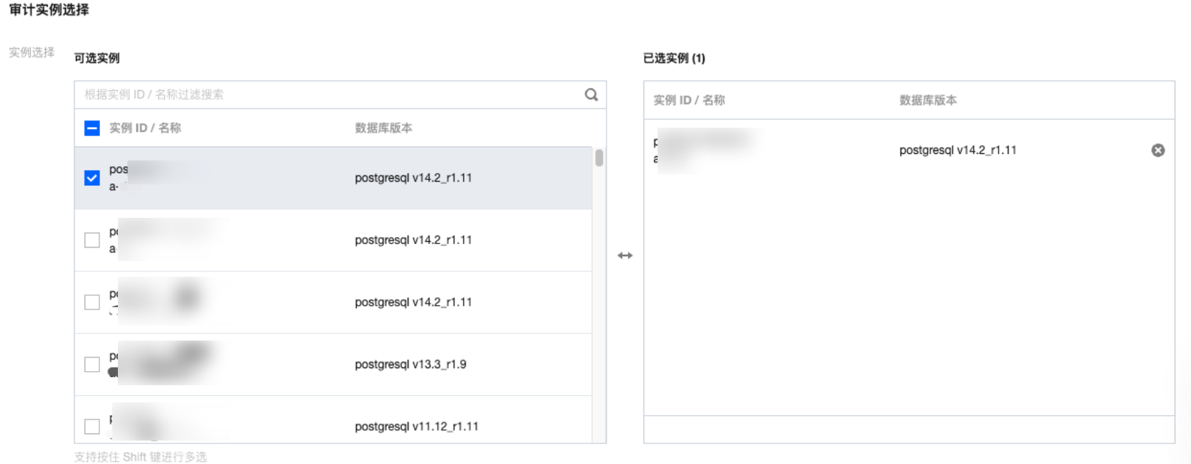 在审计实例选择项下面,系统默认勾选步骤4中所选择的实例,同时支持在此窗口下修改实例(选择其他实例、多选实例),也可在搜索框根据实例 ID /名称快速查找目标实例,完成实例选择后进入审计规则设置。
