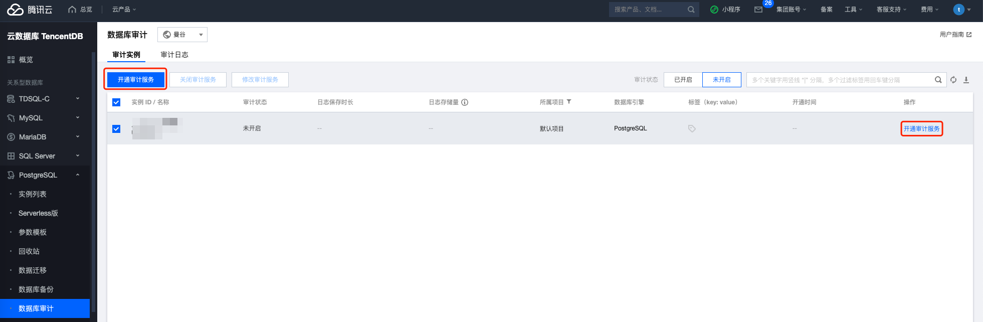 4. 在审计实例列表里找到目标实例(也可在搜索框通过资源属性筛选快速查找),在其操作列单击开通审计服务。