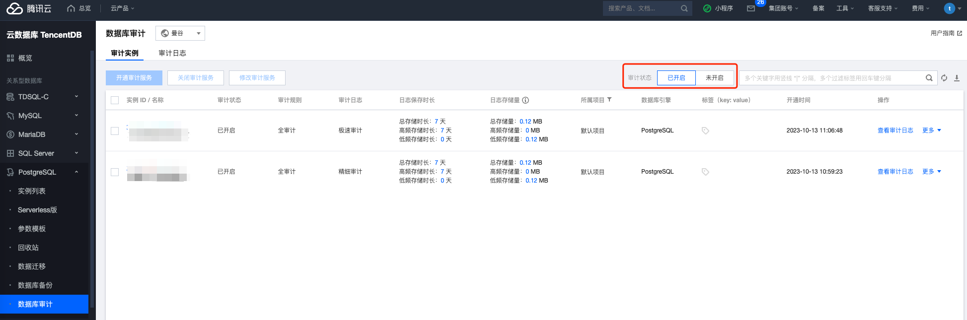 3. 在上方选择地域后,在审计实例页,单击审计状态查看当前已开启和未开启审计的实例列表。