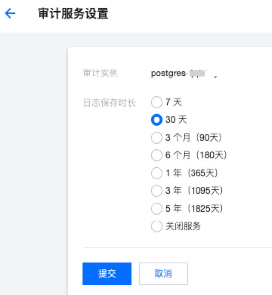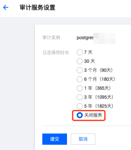 5. 您也可以单击实例 ID,进入审计日志详情,进行单个实例的审计服务设置或者关闭审计服务。