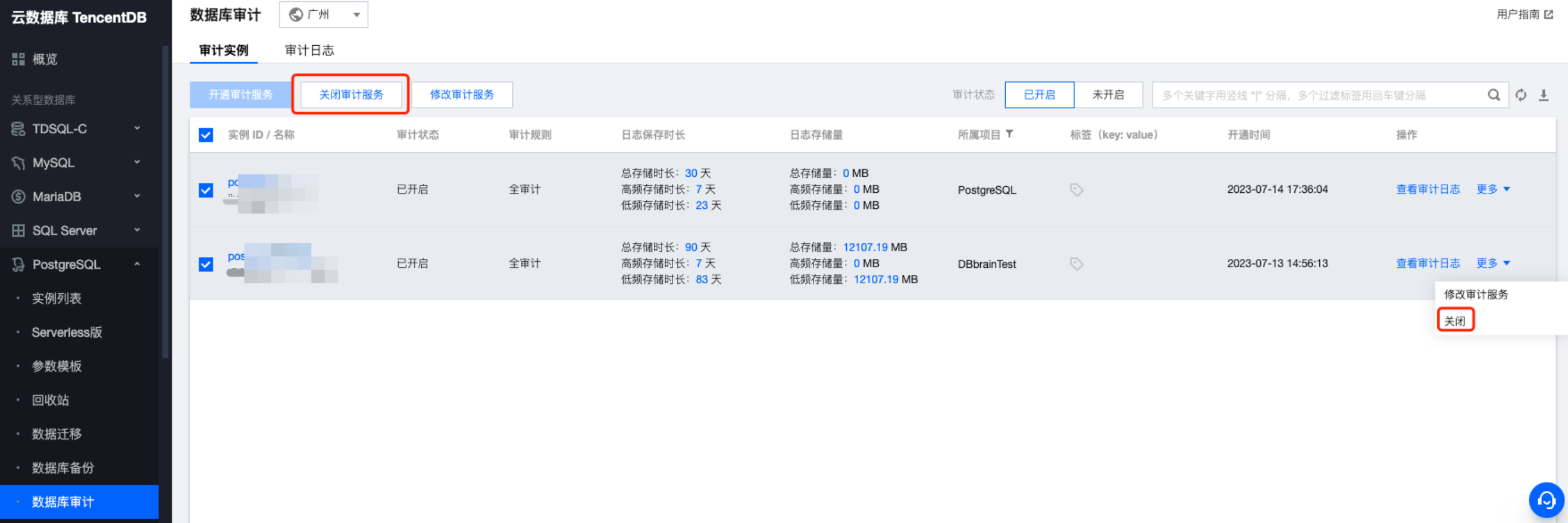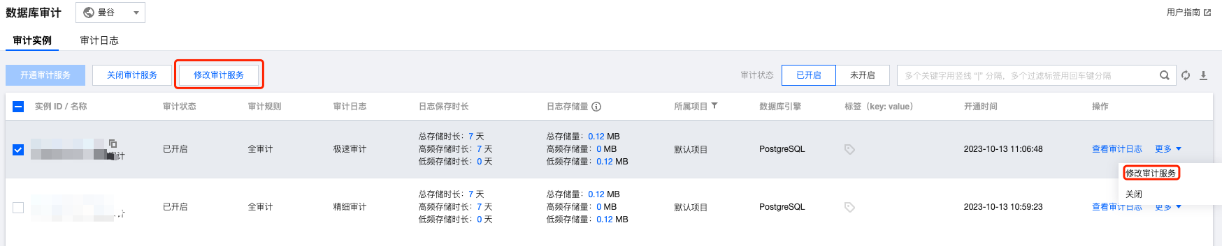 您可以在审计实例列表单次或批量关闭审计服务,也可以在审计日志列表也进行单个实例的审计设置。