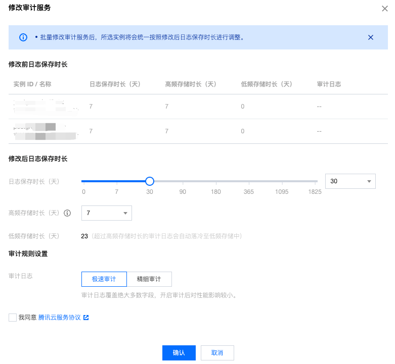 4. 您可以在审计实例列表进行单次或批量的审计服务修改,具体如下图所示: