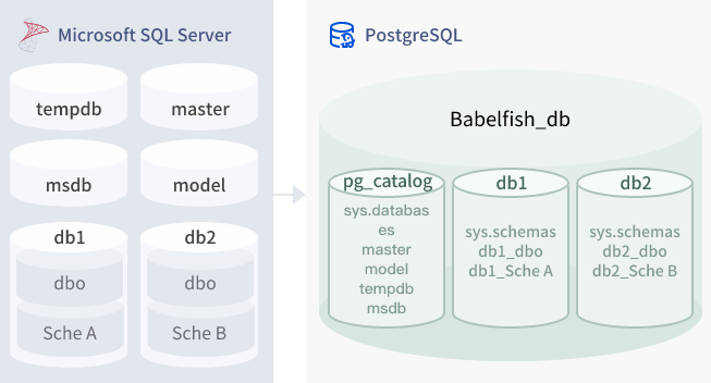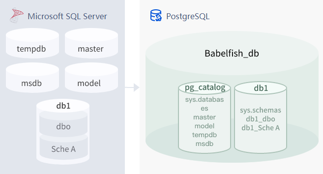 当您创建 SQL Server 用户数据库时,该数据库将映射为 babelfish_db 数据库中的 schema。数据库保留的跨数据库语法和语义等于或类似于 SQL Server 提供的语法和语义。