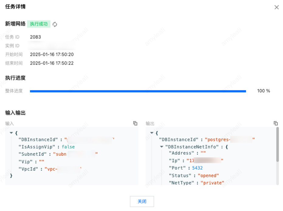 新增网络 | { "DBInstanceId":"postgres-6s1kuw28"//实例 ID "IsAssignVip":false//被分配的 VIP 是否被注册,此处均为 false "SubnetId":"subnet-piadji8r"//子网 ID "Vip":""//即将被分配的 VIP,此处均为空 "VpcId":"vpc-fz41fhgo"//私有网络 ID } | { "DBInstanceId":"postgres-6s1kuw28"//实例 ID "DBInstanceNetInfo":{//新增网络详情 "Address":"" "Ip":"10.0.10.15" "Port":5432 "Status":"opened" "NetType":"private" "VpcId":"vpc-fz41fhgo" "SubnetId":"subnet-piadji8r" "ProtocolType":"postgresql" } } |