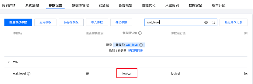 进入控制台,找到需要采集数据的实例,在实例详情页面单击参数设置,将 wal_level 参数默认值修改为为 logical ,参数值修改后需要重启实例才能生效。
