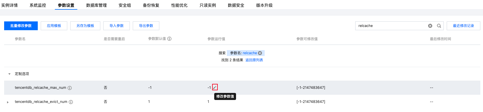 tencentdb_relcache_max_num | 一个进程最多能拥有多少个 relcache ,超过此数量开始进行缓存淘汰。 默认值为-1 ,表示不开启该功能。 | 如果系统中存在大量表或频繁访问不同表,可能导致 relcache 数量激增,建议取值范围为1000 - 5000,具体数值请根据实例的内存大小和负载情况调整。 如果实例内存充足且访问表数量不多,可以保持默认值-1,关闭该功能,避免频繁淘汰带来的性能开销。 |