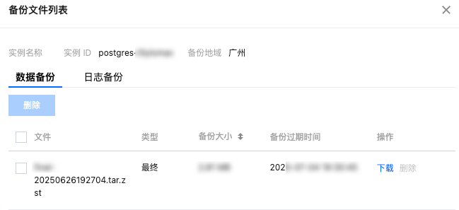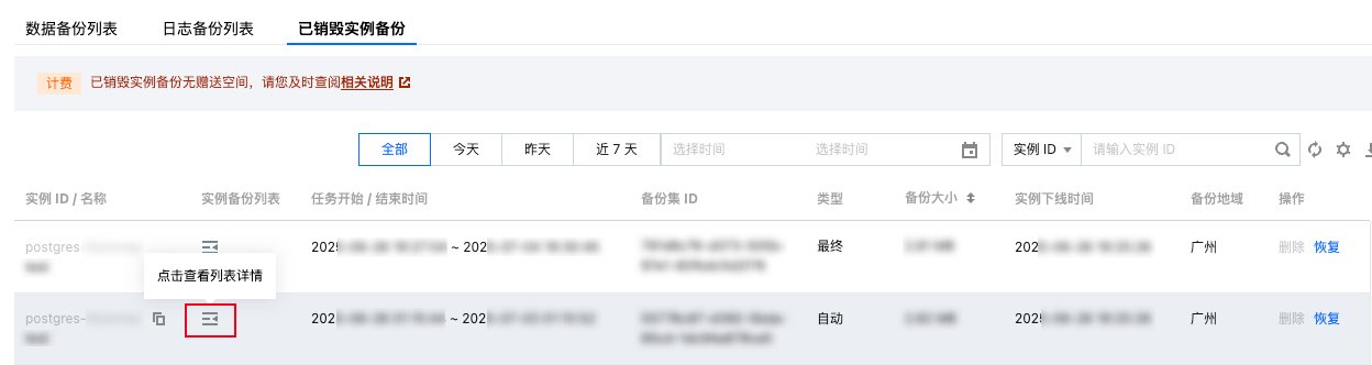 当实例从回收站中下线之后,您可以到已销毁实例备份页面查看其数据备份和日志备份文件。系统支持通过备份文件创建时间、实例 ID 、实例名称、实例 IP 筛选指定备份集。登录 云数据库 PostgreSQL 控制台 > 数据库备份 页面,选择备份列表 > 已销毁实例备份。系统支持快捷筛选今天、昨天、近7天的实例。您也可在列表右上方的时间筛选框自定义选择开始与结束时间,将对“任务开始/结束时间”进行筛选。 恢复已删除实例