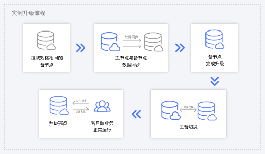 针对当前进入升级流程的主实例,系统将拉取一个新的规格类型与原实例相同备节点,再将主节点的数据同步到新的备节点中,并在该备节点完成升级。升级完成后,将在用户指定的切换时间内进行主备切换。