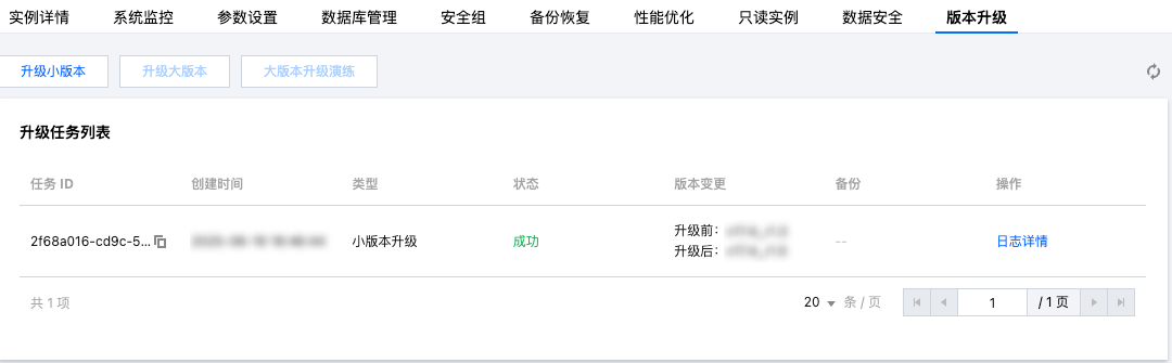升级任务结束后,在实例详情页的版本升级中,将显示本次升级任务记录。
