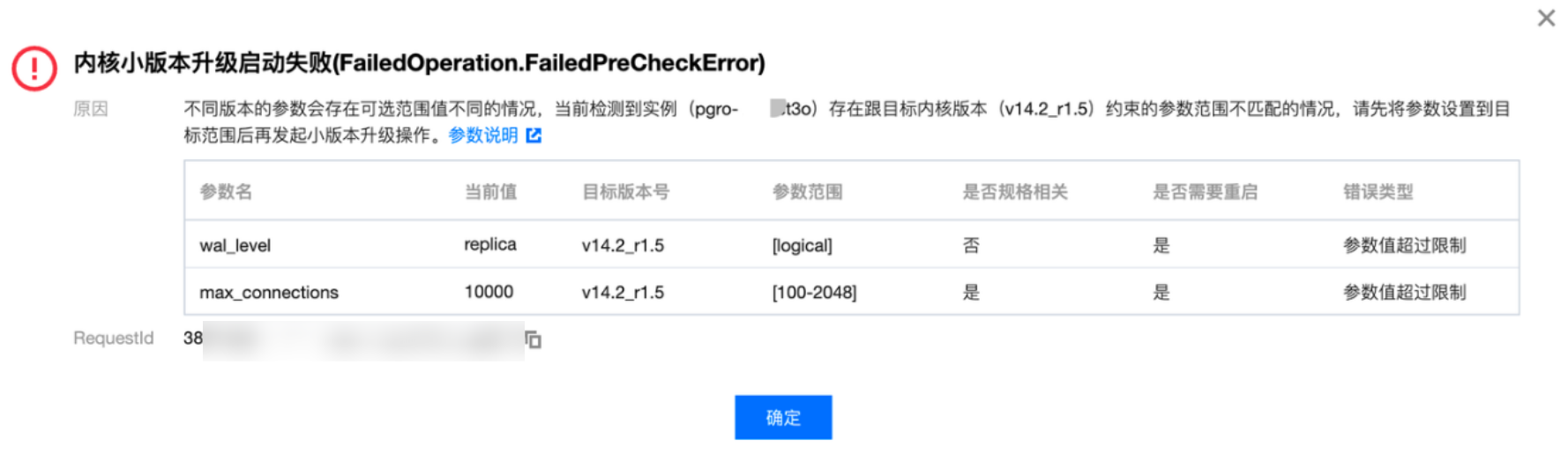 2. 参数兼容性检查:系统将检测用户自定义的参数及系统管控参数是否与新版本兼容,防止参数失效或冲突。对于用户自定义参数,若目标内核版本对应的参数范围与实例原内核版本对应的参数范围存在差异,参数值超过目标内核版本规定的范围时,会给出相应的提示,由用户自行修改,如下图所示。