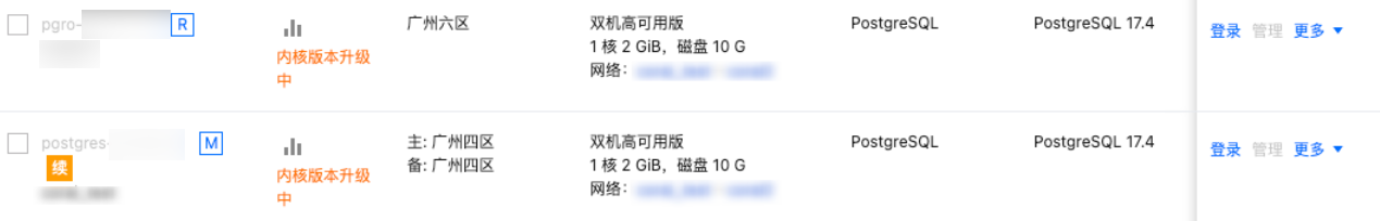 当发起主实例内核小版本升级任务时,该主实例所关联的已隔离、下线但还未回收的只读实例都会被连带升级,且主、备实例状态均转变为“内核版本升级中”。处于该状态的实例仍可正常登录使用,但无法进行管理操作。每当一个实例升级完毕,其状态将恢复为“运行中”。