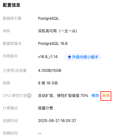 2. 实例详情 > 配置信息 > CPU 弹性扩容,单击关闭