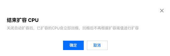 关闭自动扩容后,已扩容的 CPU 会立即缩容到实例扩容前的 CPU 核数,回缩后不再根据扩容阈值进行扩容。