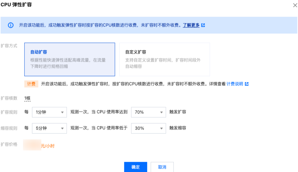 3. CPU 弹性扩容窗口下,完成如下配置,确认扩容费用,单击确定