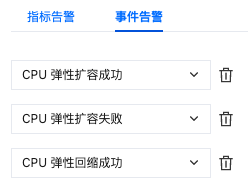 触发条件:找到事件告警,单击添加事件,分别添加 CPU 弹性扩容、CPU 性能扩容失败、CPU 弹性回缩告警事件。