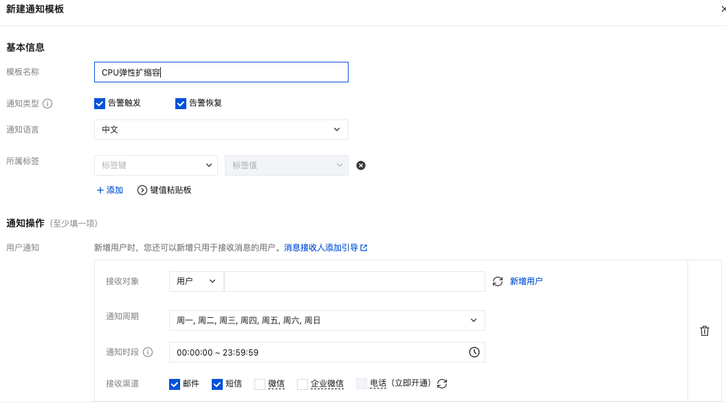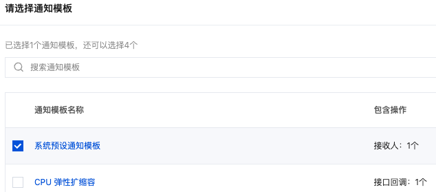 配置告警通知:支持选择系统预设通知模板和用户自定义通知模板,自定义通知模板请参见 新建通知模板。 选择系统预设模板