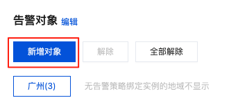 1. 在 告警策略 页,单击策略名称,进入管理告警策略页。 2. 在管理告警策略页的告警对象栏,单击新增对象。