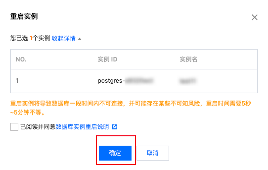 重启数据库有几率失败,这是正常现象,如果重启时间超过10分钟建议 提交工单 咨询。 2. 在弹出的对话框,勾选同意后,单击确定。