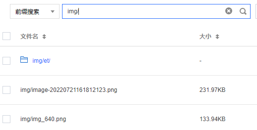前缀搜索:根据相同的对象前缀进行搜索,并展示带有相同对象前缀的对象、文件夹的搜索结果。