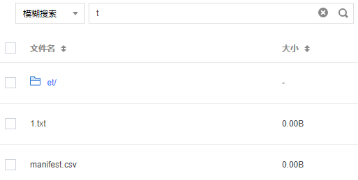 5. 在页面上方的搜索框中,输入搜索关键词,单击 ,即可展示包含该关键词的对象、文件夹的搜索结果。例如输入关键词t,则展示包含t的对象、文件夹的搜索结果。 使用 REST API/SDK