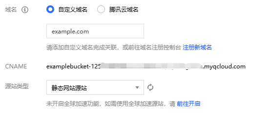 2. 自定义源站域名区域,单击添加域名,输入自定义域名(如无,则注册域名后再输入),源站类型选择为静态网站源站。关于配置项的更多介绍,请参见 开启自定义源站域名