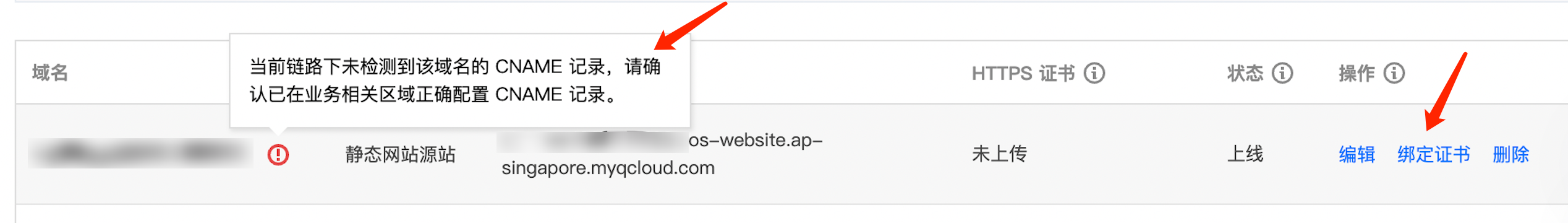 3. 为使自定义域名生效,还需要设置自定义域名解析到静态网站 CNAME 域名。如需要 HTTPS 访问,需要绑定 HTTPS 证书。详情可参见 配置域名解析绑定证书