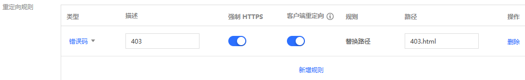 若类型选择错误码,规则默认为“替换路径”。替换路径即触发该重定向规则后,原请求地址会被替换到新页面的路径。