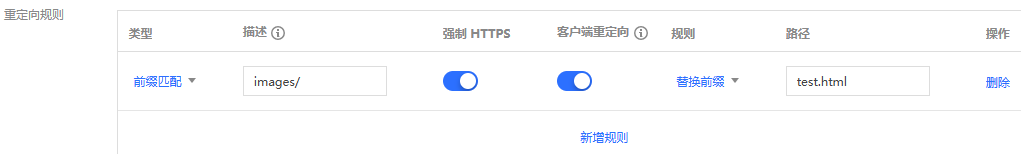 当您删除了images/文件夹(即删除了具有前缀images/的所有对象)。您可以添加重定向规则,将具有前缀images/的任何对象的请求重定向至test.html页面。