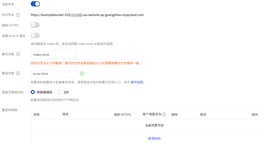 错误文档(可选):错误文档指访问静态网站出错后返回的页面。该配置项方便您自行定义错误文档。当静态网站无法响应用户的请求时,将返回指定的自定义错误页面。例如您配置了命名为 error.html 的错误文档,当用户访问遇到 HTTP 错误时,页面将返回 error.html 页面,为其提供帮助指引。当您未配置错误文档时,此时用户访问遇到 HTTP 错误,页面将返回默认的错误信息。