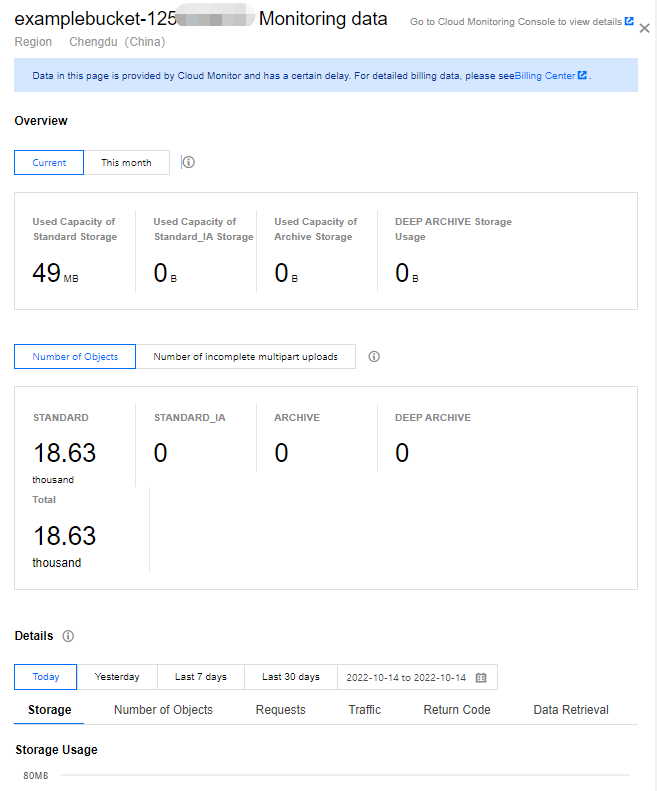 对于存储用量和对象数量,仅支持查看2020年03月01日之后的数据,若需查看更多详细数据,请前往 计费中心,选择对应时间段并导出数据查看。 通过子账号查询操作步骤