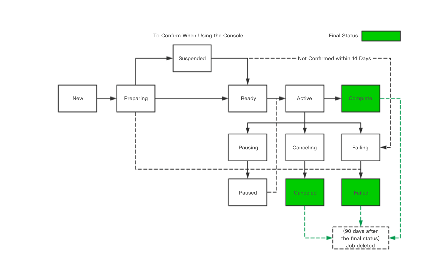 Active | 可转换至 Complete、Failing、Pausing 或者 Cancelling 等状态。当您的任务成功结束或者失败时,或者由于您的中止命令,例如取消任务时,状态会根据具体的原因进行切换。 | |