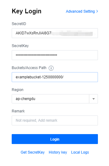 1. API 密钥 secretID 和 secretKey :通过访问管理控制台的 API 密钥管理 页面获取,成功登录后密钥将保存在历史密钥中,方便下次继续使用。 2. 存储桶/访问路径:使用主账号登录时可不填写,若使用子账号登录需填写已授权的路径。例如:example-1250000000/test/。