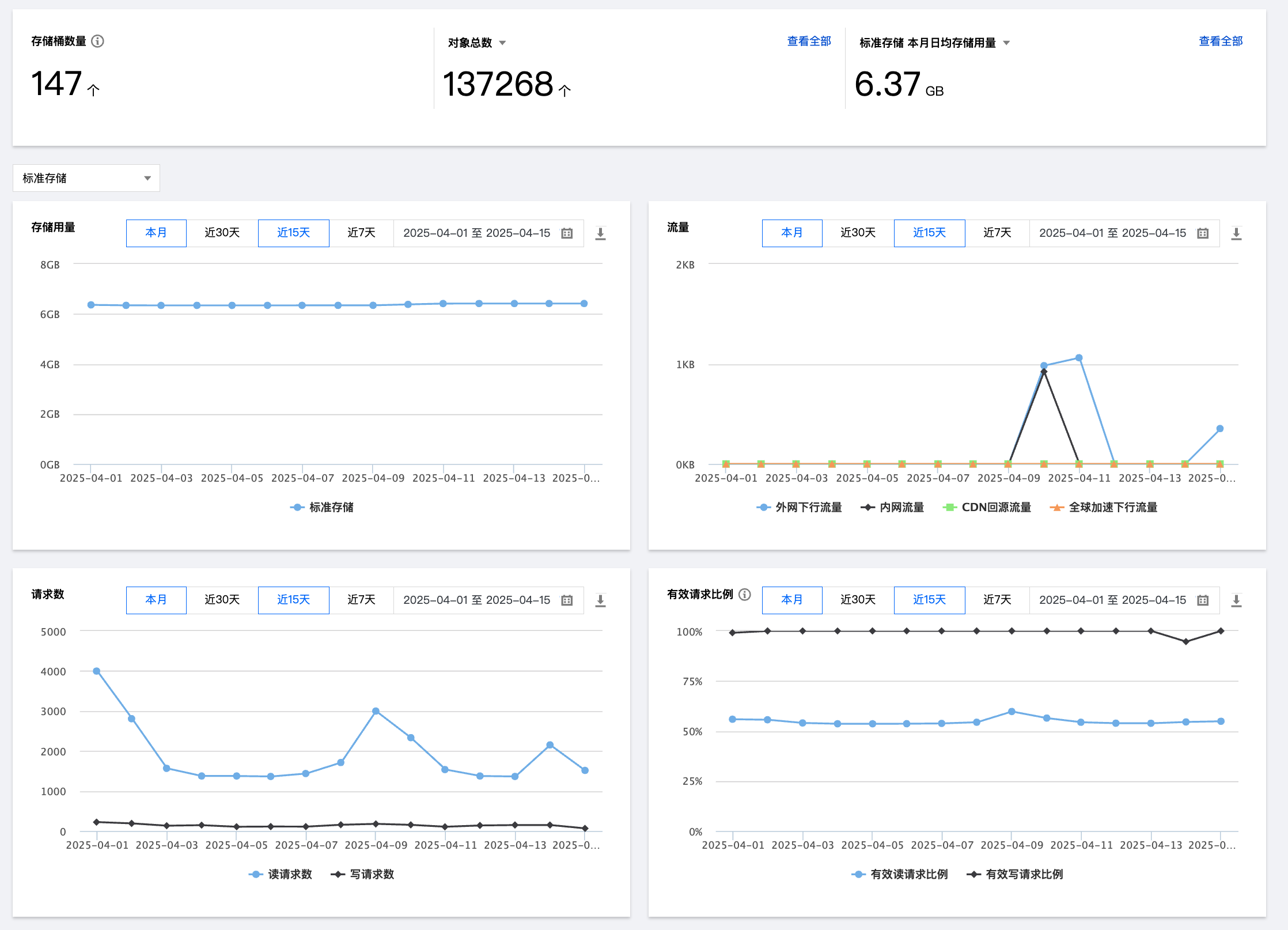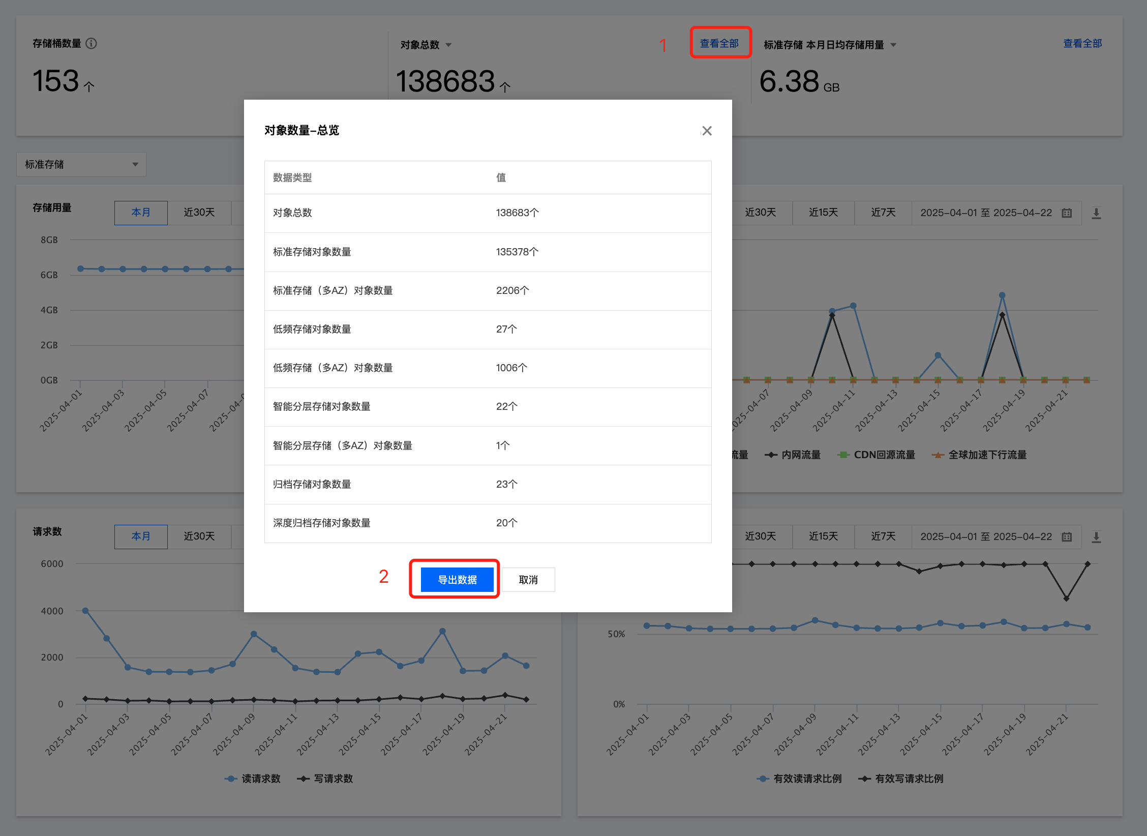 对象数量:当前已创建所有存储桶中的对象总数,支持下拉选择查看不同存储类型的对象数量。单击右上角的查看全部,即可快速查看各个存储类型的详细数据,并支持数据导出,详情请参见 查看和导出总览数据。 本月日均存储用量:支持下拉选择查看标准存储、标准存储(多 AZ)、低频存储、低频存储(多 AZ)、智能分层存储、智能分层存储(多 AZ)、归档存储、归档存储(多 AZ)、深度归档存储的日均存储用量。其中,日存储容量 = 当日“每5分钟存储容量”之和 / 288(采样点数),当月的日均存储用量 = 当月每天的日存储容量之和/当月天数。单击查看全部,即可快速查看各个存储类型的详细数据,并支持数据导出,详情请参见 查看和导出总览数据。 存储用量折线图:可查看标准存储、标准存储(多 AZ)、低频存储、低频存储(多 AZ)、智能分层存储、智能分层存储(多 AZ)、归档存储和深度归档存储的存储用量,支持查询前90天的数据明细,每次查询时间跨度不超过31天。