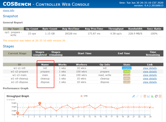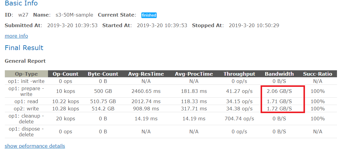 <?xml version="1.0" encoding="UTF-8" ?><workload name="s3-50M-sample" description="sample benchmark for s3"><storage type="s3" config="accesskey=************************************;secretkey=************************************;endpoint=http://cos.ap-beijing.myqcloud.com" /><workflow><workstage name="init"><work type="init" workers="10" config="cprefix=examplebucket;csuffix=-1250000000;containers=r(1,10)" /></workstage><workstage name="prepare"><work type="prepare" workers="100" config="cprefix=examplebucket;csuffix=-1250000000;containers=r(1,10);objects=r(1,1000);sizes=c(50)MB" /></workstage><workstage name="main"><work name="main" workers="100" runtime="300"><operation type="read" ratio="50" config="cprefix=examplebucket;csuffix=-1250000000;containers=u(1,10);objects=u(1,1000)" /><operation type="write" ratio="50" config="cprefix=examplebucket;csuffix=-1250000000;containers=u(1,10);objects=u(1000,2000);sizes=c(50)MB" /></work></workstage><workstage name="cleanup"><work type="cleanup" workers="10" config="cprefix=examplebucket;csuffix=-1250000000;containers=r(1,10);objects=r(1,2000)" /></workstage><workstage name="dispose"><work type="dispose" workers="10" config="cprefix=examplebucket;csuffix=-1250000000;containers=r(1,10)" /></workstage></workflow></workload>