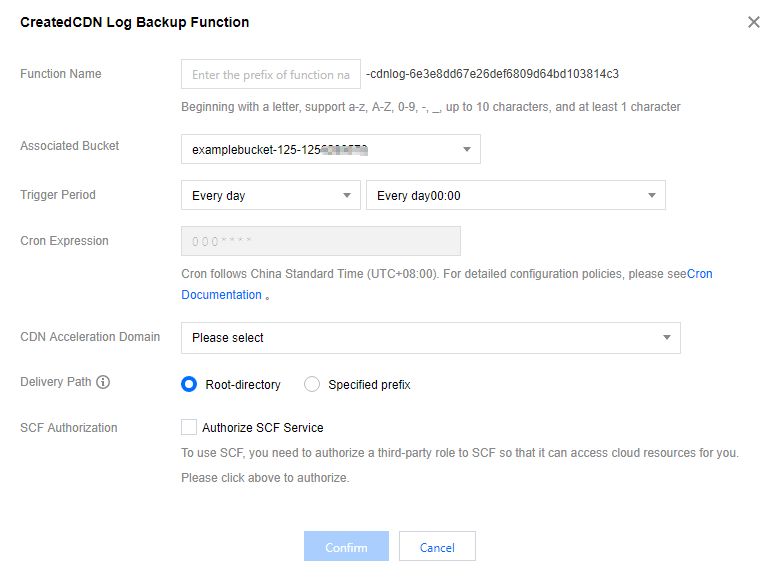 SCF 授权:CDN 日志备份需要授权云函数从您的 CDN 服务中读取日志文件,并将日志文件转存至您指定的存储桶中。因此需要添加此授权。