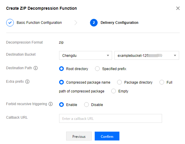 通过控制台使用:您可以在控制台配置 ZIP 文件解压函数,配置完成后,对于新上传到存储桶内的 ZIP 文件,将会自动进行解压。