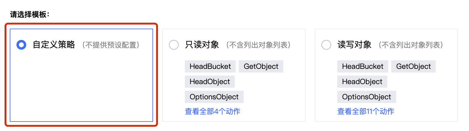 其他模板:根据您选择的被授权用户和资源范围的不同组合,COS 为您提供不同的推荐模板。勾选相应的模板后,在第二步配置策略中,COS 会为您自动添加相应的操作。