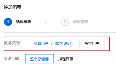 所有用户(可匿名访问):当您希望为匿名用户开放操作权限时,选择此项。在下一步配置策略时会为您自动添加所有用户,表示为*。